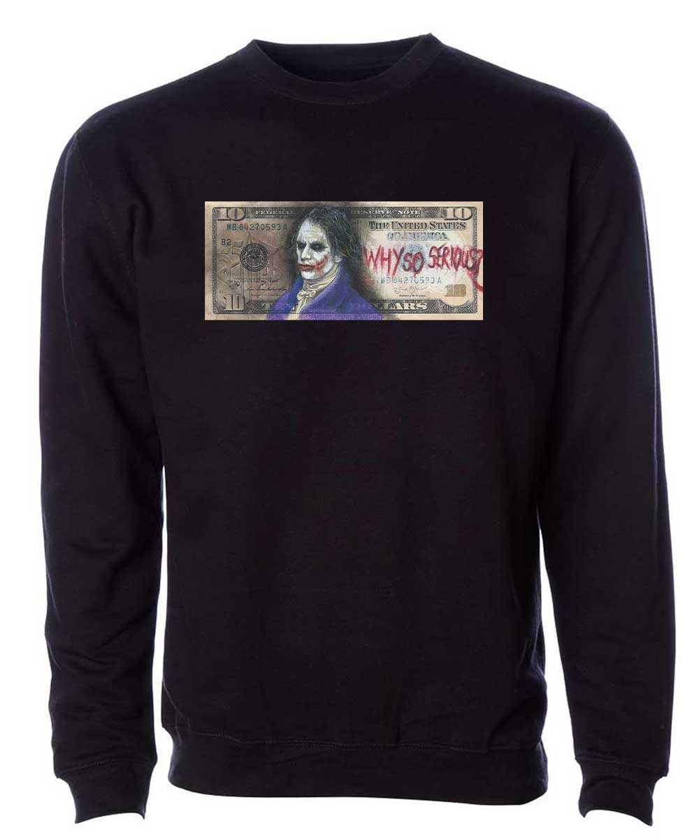 Heath Ledger’s legendary portrayal of The Joker is immortalized as money art. To the right of the art contains his infamous quote, “Why so serious?”